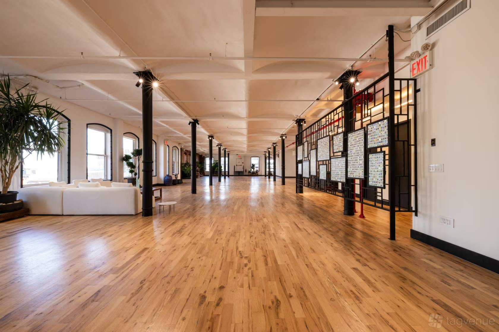 This unique space, perfect for corporate events, offers an impressive area of 7,390 square feet with barrel ceilings reaching 13 feet. It is designed to comfortably accommodate up to 225 people in a seated arrangement and 275 for receptions. The environment is enhanced by 10-foot windows, allowing for abundant natural light, thereby creating an inspiring and professional atmosphere. Amenities include private lift access, a fully equipped kitchen for meal preparation, and a wet bar for refreshments. The complete audio-visual system, combined with a Sonos music system, ensures an immersive experience for your presentations and events. Additionally, dimmable lighting allows you to adjust the ambiance according to your needs. Furthermore, a rooftop space of 6,967 square feet is also available, offering seating for 65 and 100 for receptions. This outdoor venue features a covered bar, a pergola, a fireplace, and a sunny terrace, making it the perfect setting for outdoor events. Together, these spaces provide exceptional flexibility and a remarkable setting for all your professional needs.